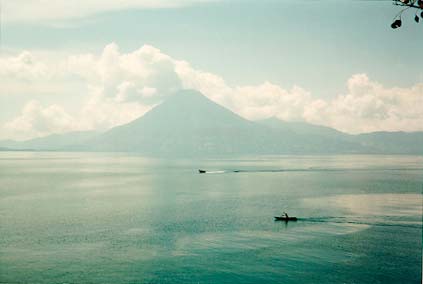 of Panajachel, dwarfs local fishing boats on Lago Atitlan in